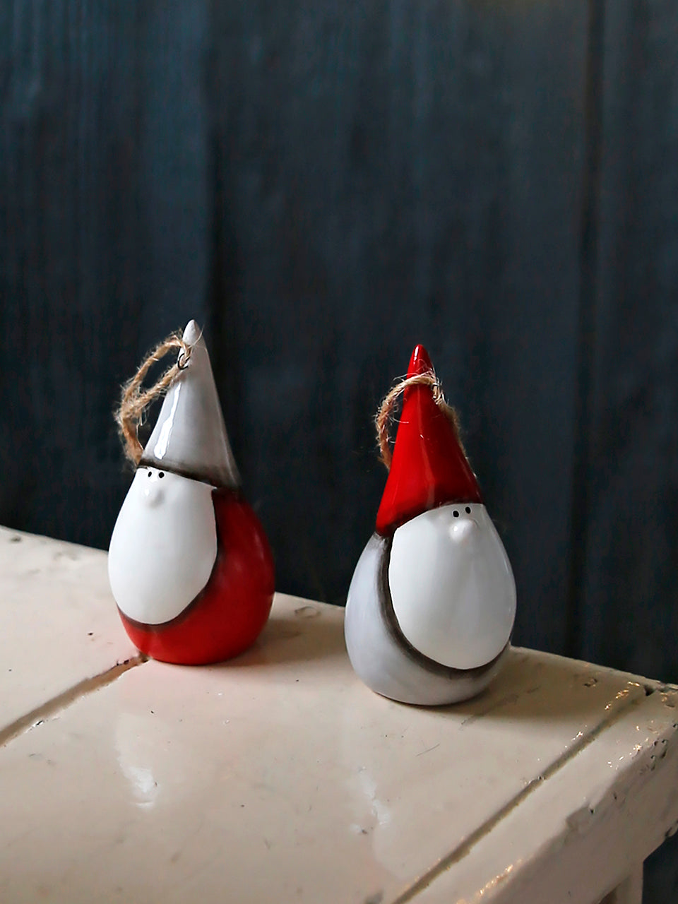Crea una decoración navideña ecléctica con originales adornos festivos colgantes entre las ramas del árbol de Navidad. Nuestros pequeños Santas de cerámica, en un contraste intenso de rojo y gris festivo, lucen igual de bien en el árbol de Navidad que en una guirnalda de chimenea.