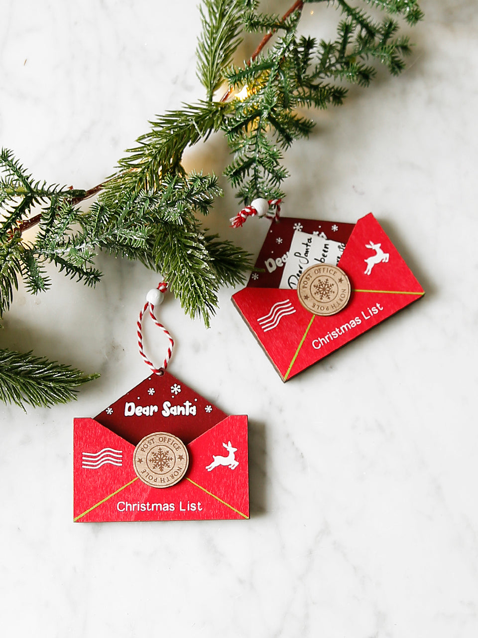 Consiéntete con Papá Noel dejando una notita con tus pedidos de regalos en este precioso adorno de madera para el árbol. Un sobre colorido y pintado con una pequeña abertura para un mensaje en papel. Un recuerdo navideño que los niños disfrutarán rellenando durante años. Terminado con una cuerda colgante de rayas de caramelo.