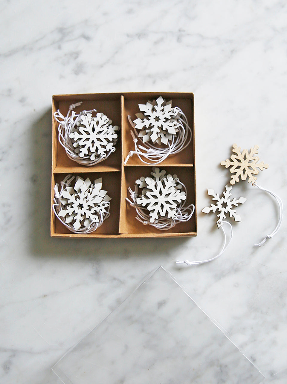 Juego navideño de madera con dos diseños de copos de nieve. La forma más natural de decorar el árbol de Navidad o las servilletas y regalos de los invitados. Cada juego incluye 24 adornos, 12 de cada forma de copo de nieve blanco con reverso natural. Presentado en una bandeja de cartón. Hecho de madera. Dimensiones: 4,5 cm de alto x 4 cm de diámetro (cada adorno).