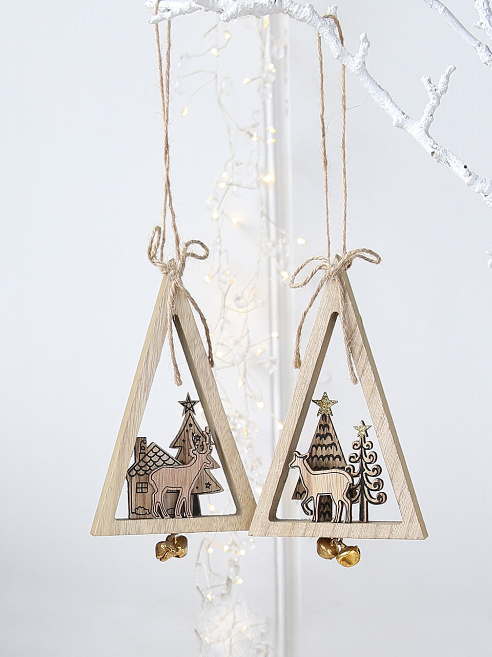 Dos escenas de renos enmarcadas con encantadoras ilustraciones impresas en cada pieza de madera y pequeñas campanillas debajo. Cada decoración es un cordel colgante listo para adornar el árbol.