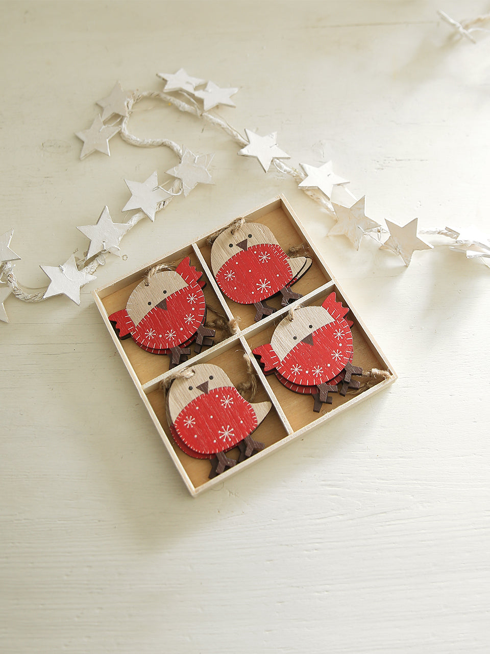 Cada set incluye cuatro de cada uno de los dos diseños diferentes de petirrojo. ¡El más corpulento claramente se ha excedido en la mesa de pájaros! Las decoraciones vienen precolgadas con cordel y son ideales para decorar el árbol o adornar regalos. Se presentan en una bandeja de madera sellada con 8 decoraciones de petirrojo incluidas. Las piezas pequeñas no son aptas para menores de 3 años. Dimensiones: Cada decoración: 6 cm de alto x 5,5 cm de ancho x 0,3 cm de profundidad. Hecho de: Madera.