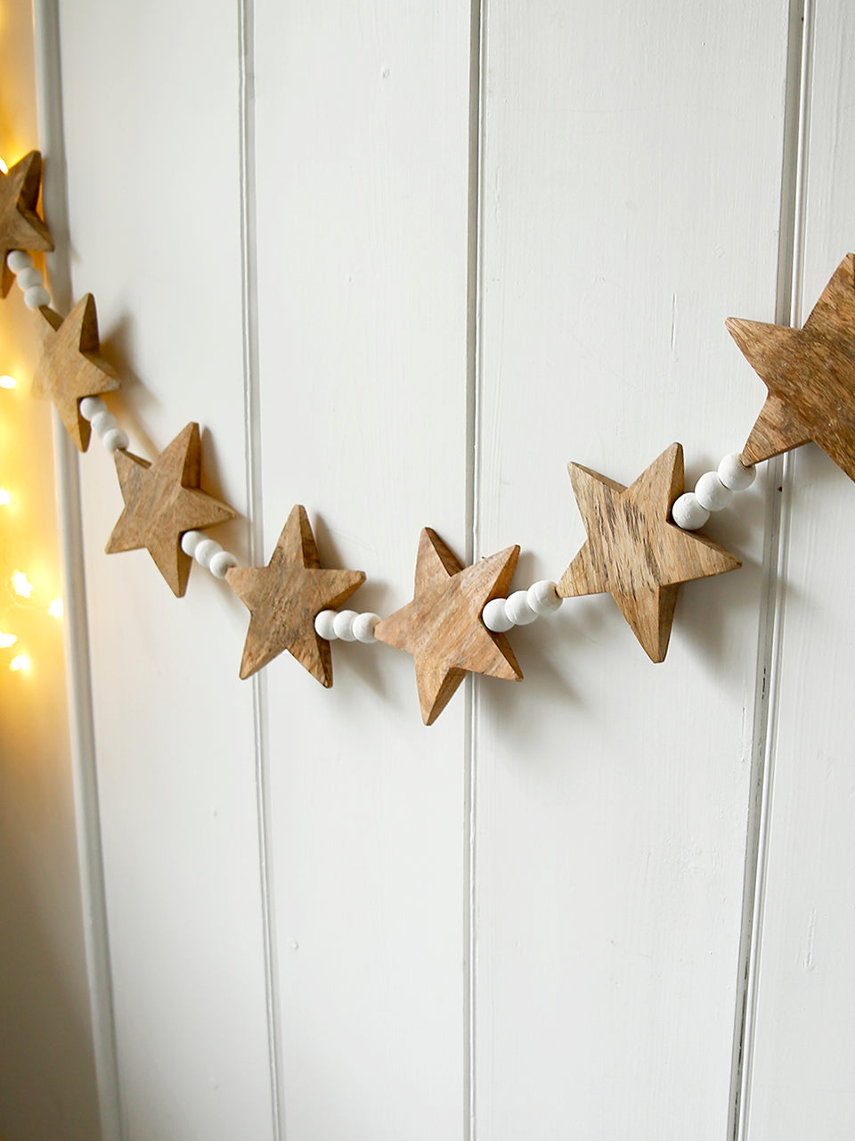 Maravilloso surtido estacional de estrellas de madera y cuentas blancas que crean una encantadora decoración navideña natural.